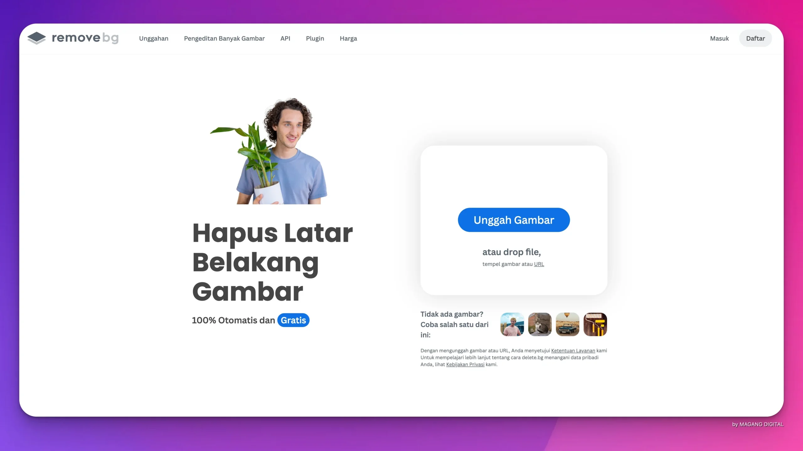 Tool ini sering jadi pilihan utama dalam kategori aplikasi desain AI gratis karena bisa langsung dipakai tanpa ribet. Cocok buat kamu yang sering bikin desain produk, poster, atau konten promosi yang butuh background bersih.